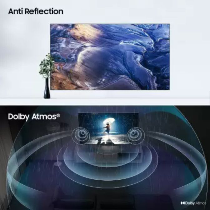 The Samsung TV features Neo Quantum HDR+ technology for vibrant colors and sharp visuals with Quantum Matrix technology. The Neural Quantum Processor delivers immersive 4K quality, while the anti-glare film ensures distraction-free viewing. Enjoy theater-like audio with Dolby Atmos. Plus, access more content and control smart devices with Samsung’s Smart Hub, SmartThings, and Samsung TV Plus.