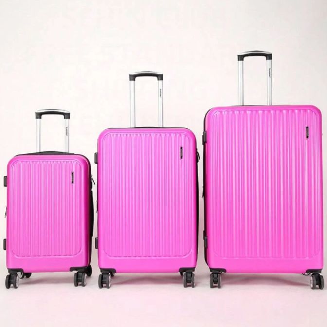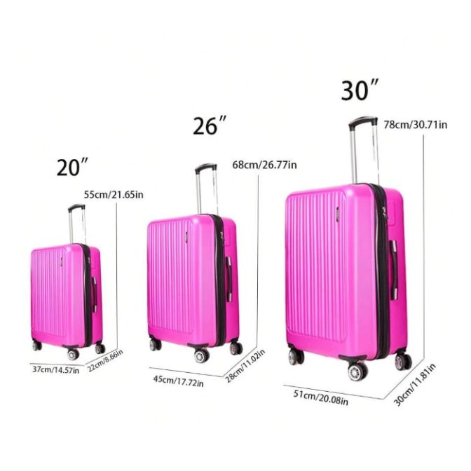 This three-piece luggage set includes 20", 26", and 30" bags made from durable ABS material in a vibrant purple color. The assembled dimensions are 27.55" L x 24.80" W x 9.84" H, weighing 27.55 lbs. The package size is 31.49" L x 19.68" W x 12.99" H, weighing 29.76 lbs.