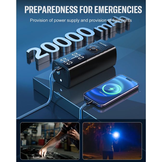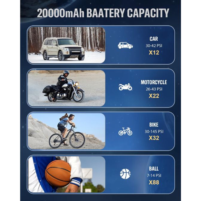 - Powerful and Versatile Air Compressor Equipped with 20,000mAh capacity, the portable air compressor lasts for 1-2 hours of continuous use and can be fully charged in just 3-5 hours, and the air pump can be used in two ways, either wirelessly or using the car cord to inflate when the battery runs out.